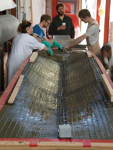 Fig. 40. Placing concrete and carbon grid (Portland cement mortar mix used) for double-curvature lenticular thin-shell vault.